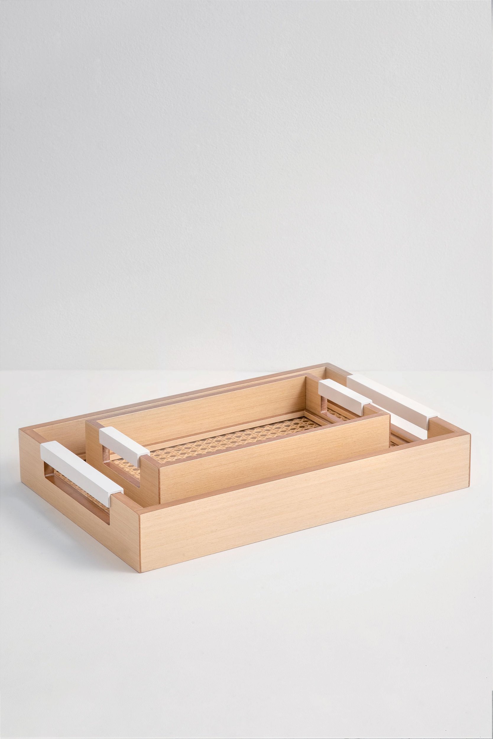 seja para servir ou para criar um espaço-bar bem lindo, a bandeja bali é perfeita para criar diferentes composições. toda elegante, ela traz a palha indiana como elemento especial e detalhe na pega em laca branca. material: MDF laminado com madeira natural (radica de marfim linheiro), acabamento em verniz incolor e fundo de vidro.