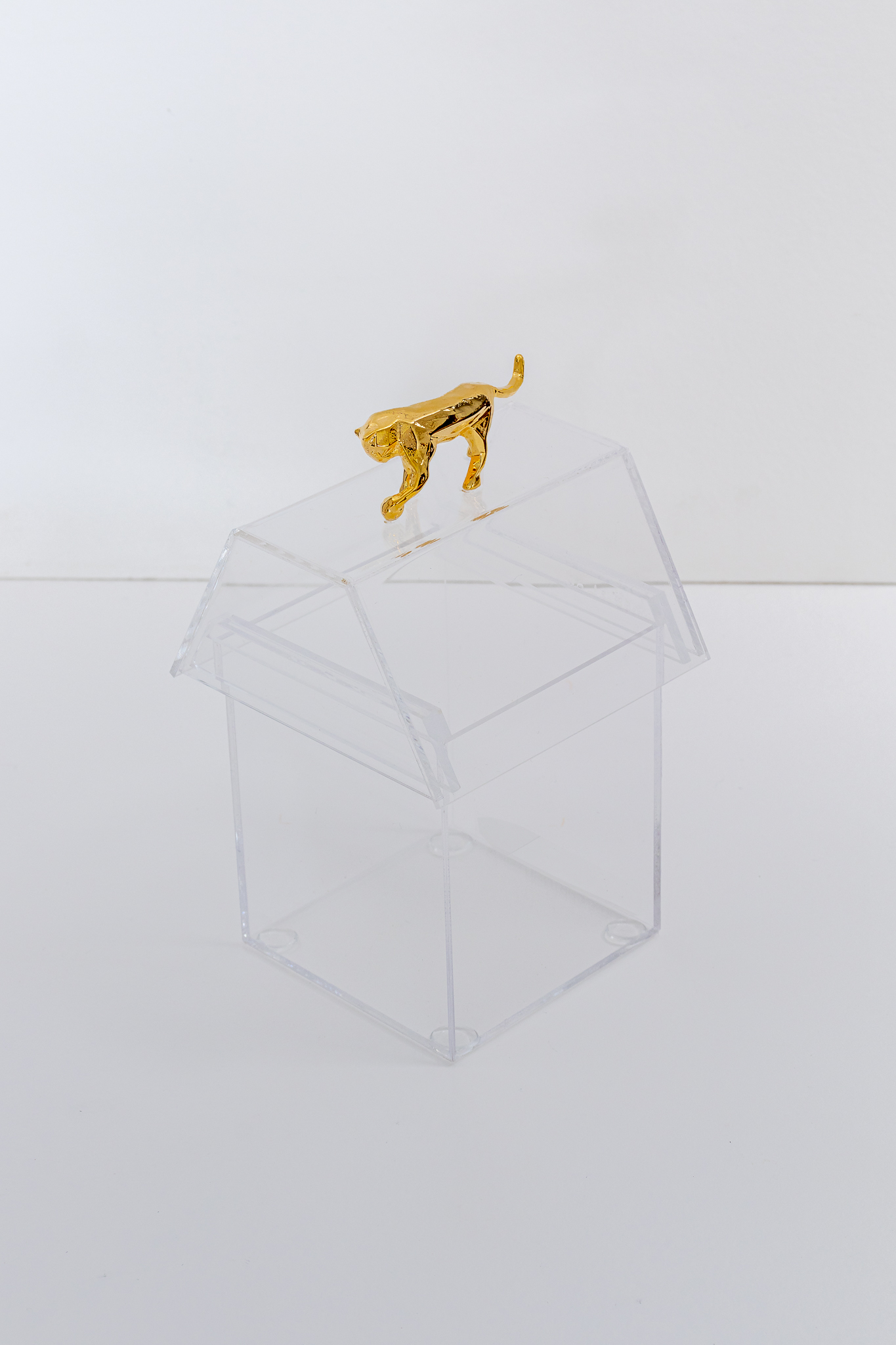 caixa em acrílico cristal, no formato de casinha, com tampa removível. traz como elemento de charme e brincadeira um gatinho em 3D, em pé, e banhado à ouro. uma peça multi funcional, com acabamento sofisticado e que dá aquele "up" na hora de decorar. este é o tamanho M e fica incrível formando uma dupla com o tamanho P.