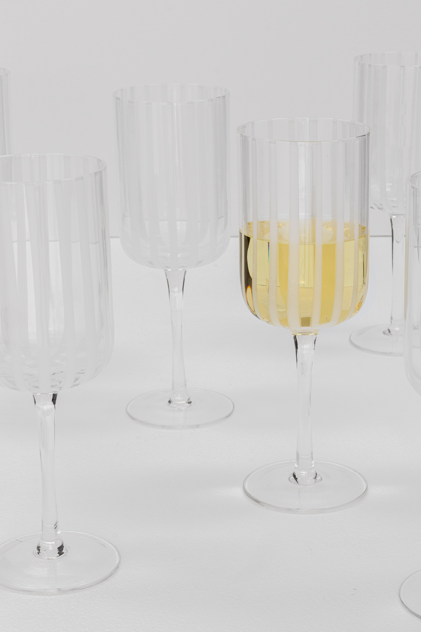 kit com seis taças de vidro oyoy. elas são transparentes, possuem formato linear, e seu diferencial fica por conta da presença de delicadas listras brancas. são ideais para servir diversos tipos de bebida, combinando estilo e funcionalidade de forma leve e atemporal.