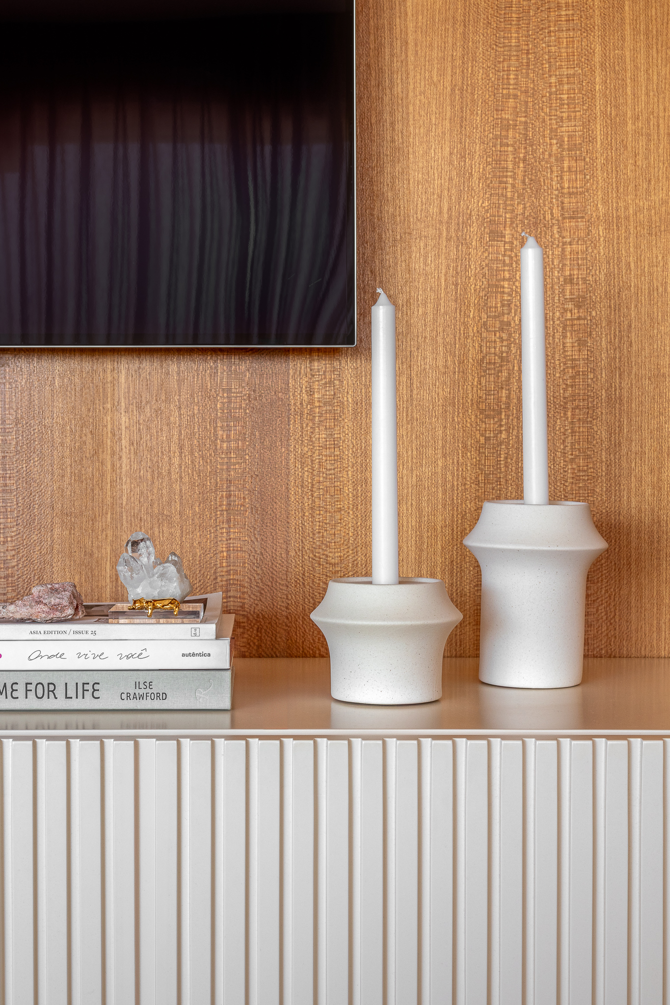 conjunto com dois castiçais, ou porta-velas, em cerâmica. possui toque texturizado, pintinhas discretas e formato clean. perfeito para criar um clima aconchegante e intimista, adicionando conforto ao ambiente ou ocasião.