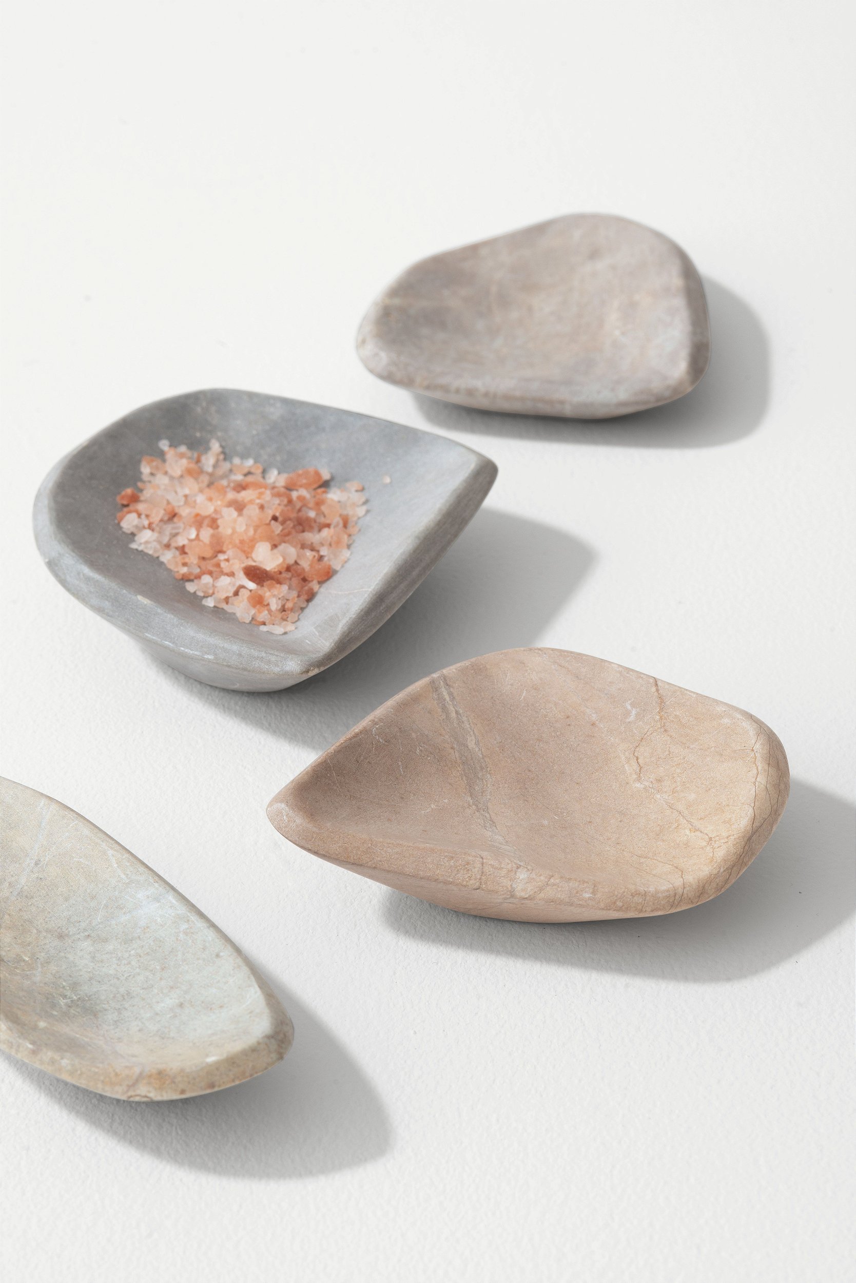 um conjunto de quatro pequenos pratos, de formas e tons variados, pensados para shoyu, mas que na verdade podem ir muito além das delícias japonesas. o kit de pratos minguei é feito de maneira artesanal, em pedra sabão, e pode ser usado também para nuts, petiscos e para te apoiar em outros ambientes, basta soltar a imaginação! PS: fica incrível com a travessa minguei.