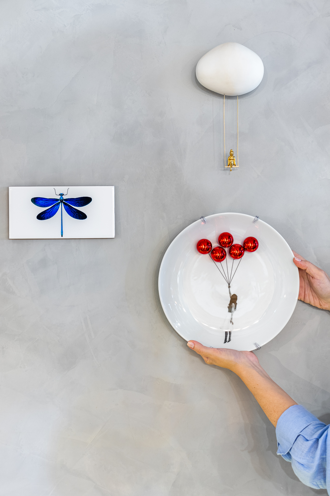 prato decorativo em porcelana com arte aplicada trazendo a ilustração de uma menina com balões vermelhos. o detalhe fica por conta dos balões vermelhos, que além de trazer cor à peça, passam a sensação de que ela está flutuando!