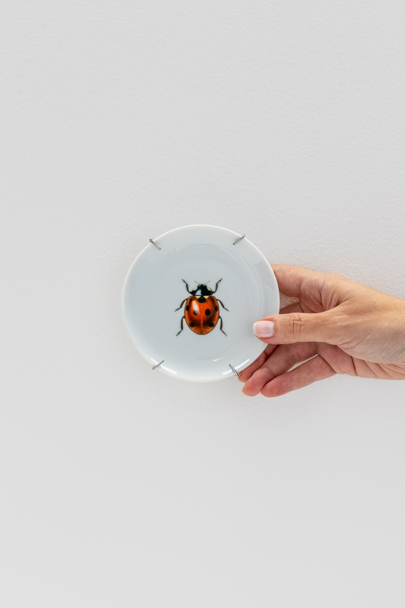 prato decorativo em porcelana com arte aplicada trazendo a ilustração e toda a delicadeza de uma joaninha vermelha. que tal uma dose de boa sorte para decorar a sua casa?