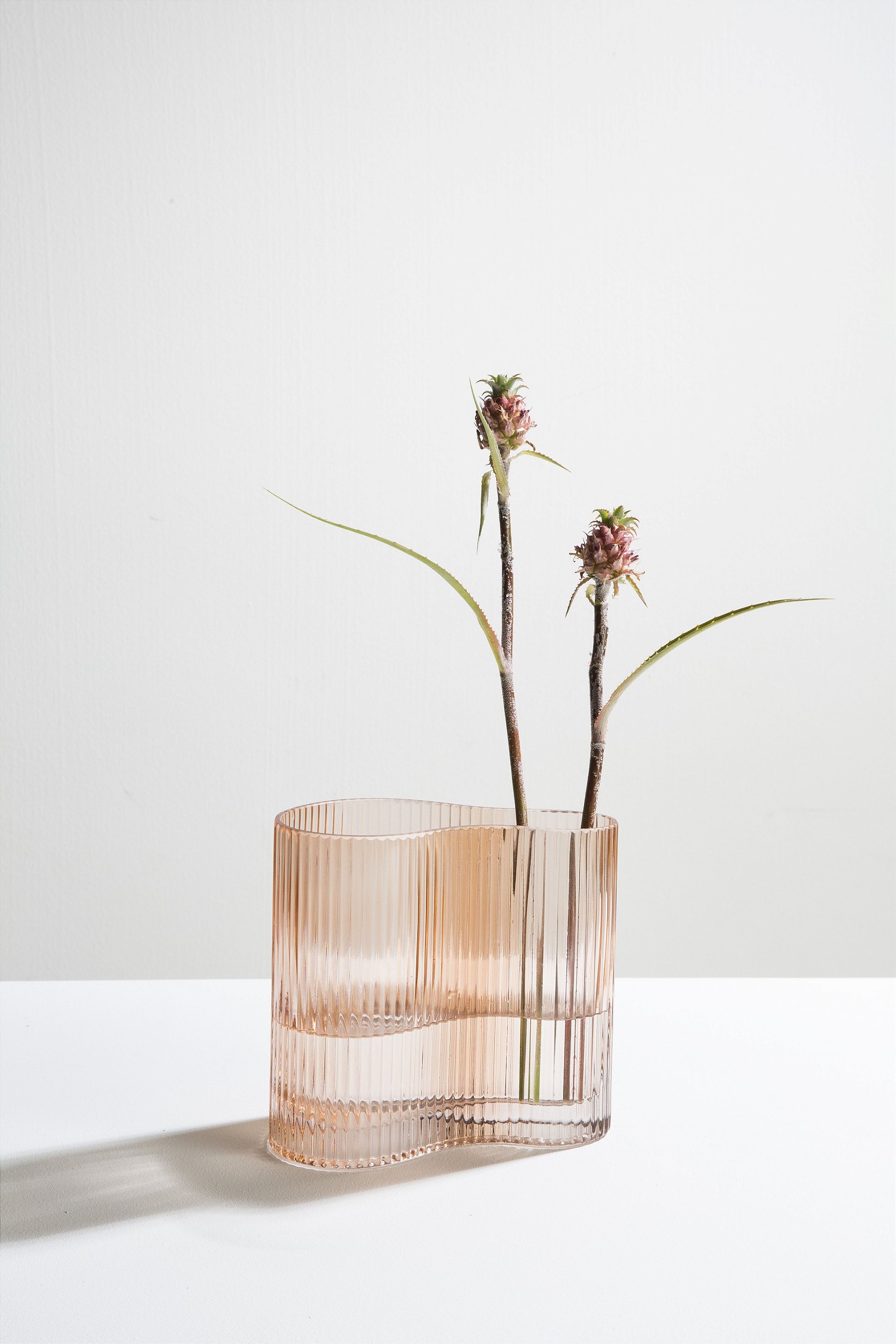com linhas sinuosas e elegantes como as de Oscar Niemeyer, o vaso meyer é todo em vidro canelado, ultra moderno e cheio de personalidade. lindo com ou sem flores, fica ainda mais incrível quando combinado com os outros tamanhos da linha. toda autêntica, essa é a versão rosé.